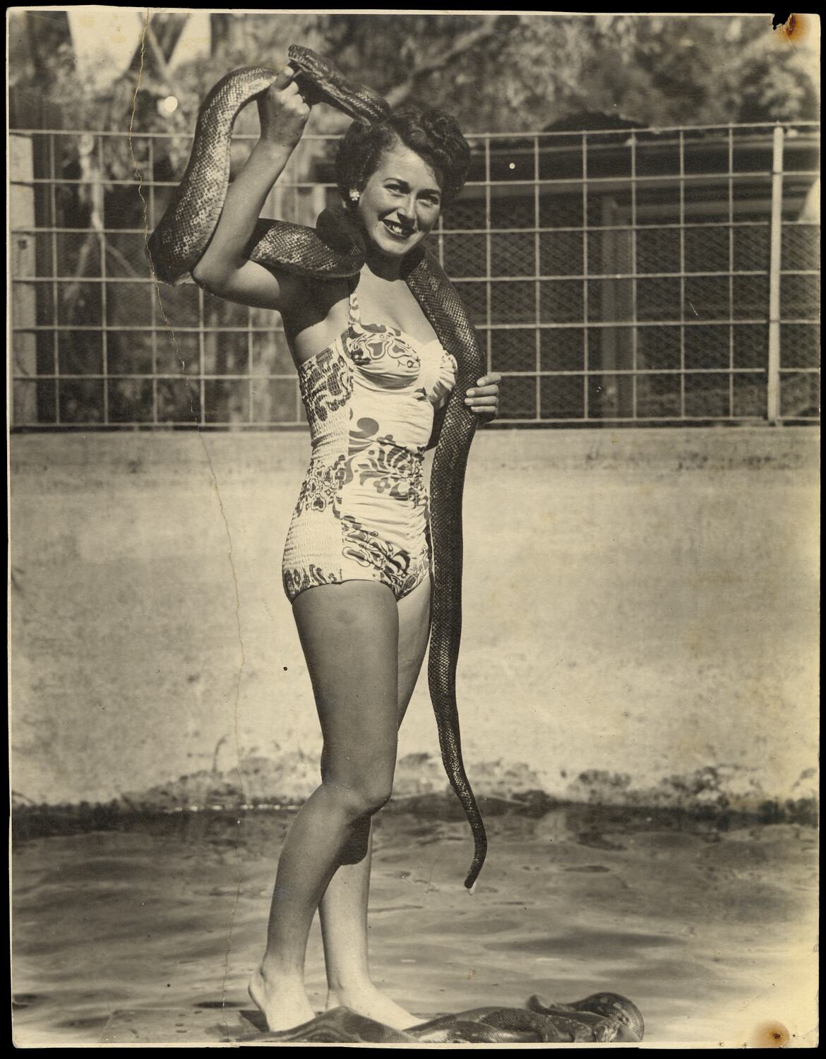 Photograph of Bernice Kopple, full-length, in a one-piece patterned swimsuit standing with a python draped aorund her neck and other snakes at her feet in an animal outdoor enclosure, at Adelaide Sanctuary, in 1951. In the 1950s and 1960s Bernice Kopple worked as a fashion photographic model and as a performer on the Tivoli Circuit.