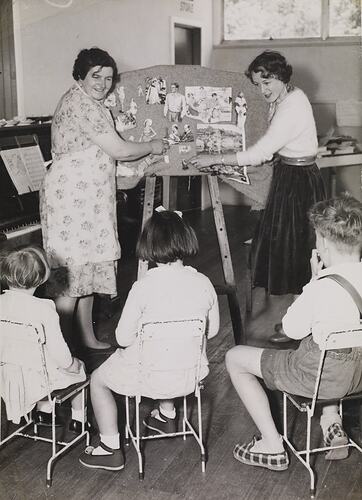 Photograph of Lucy Hathaway (on left), Supervisor of McCallum House Centre for intellectually disabled children, Ballarat, circa 1957.