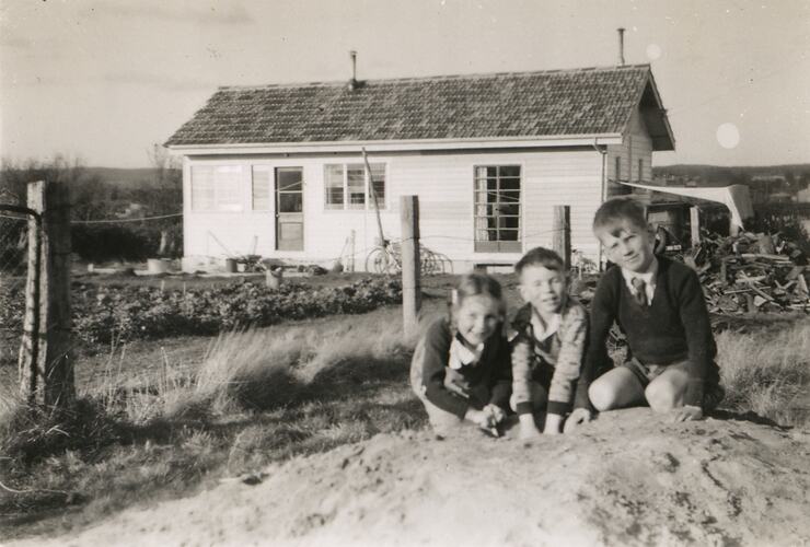 Photograph of Merle Hathaway, Ian Hirst and Robin Hirst playing in heap outside the back of our half-built house in Wendouree.