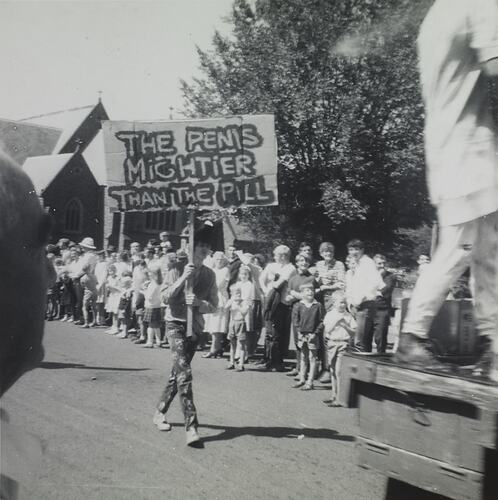 Photograph of Henry Winkler (who became one of Melbourne's well-known graphic designers) carrying "The penis mightier than the pill" as part of the Begonia Festival in Ballarat.