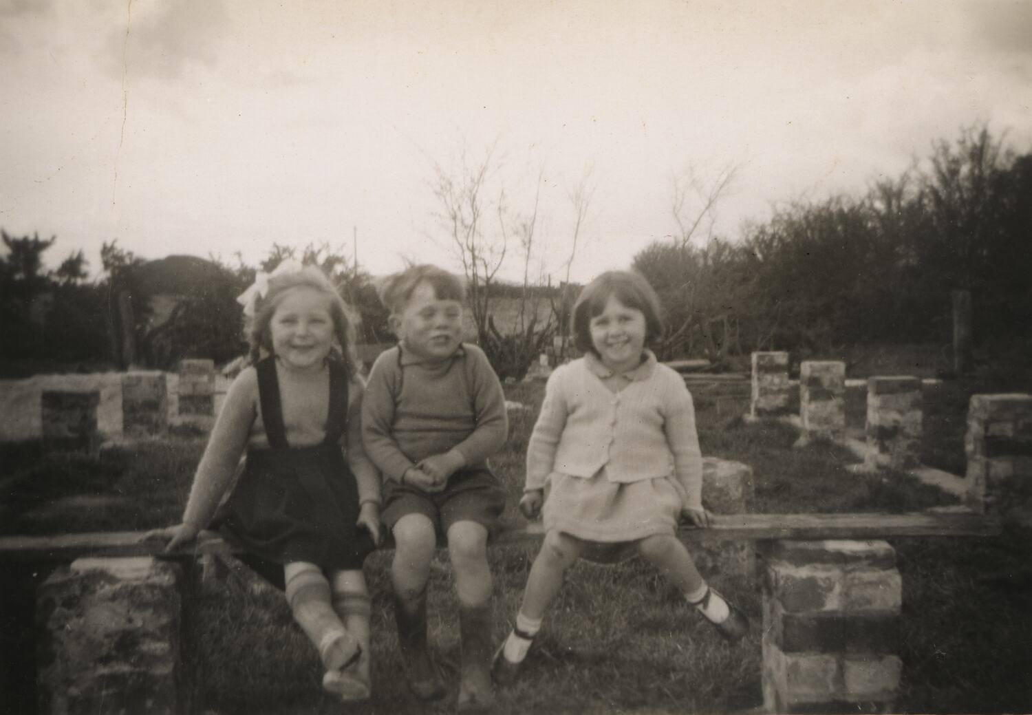 Photograph of Merle Hathaway, Ian Hirst and another friend (Judith?) sitting on the foundations of the Hathaway family's house at 29 Grammar St, Wendouree.