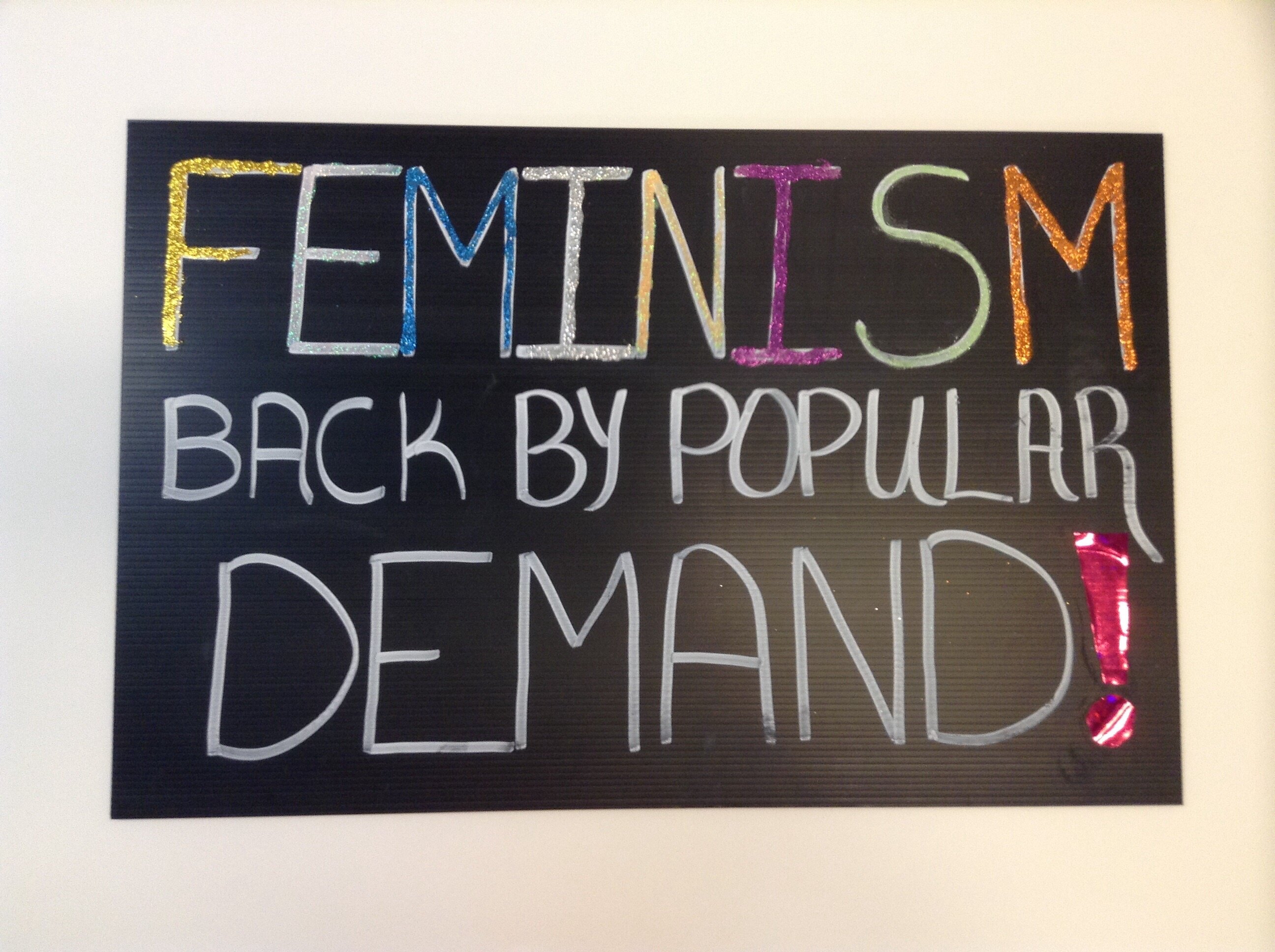 Handmade sign with the slogan 'Feminism Back by Popular Demand' used at the Women's March on Melbourne. On Saturday 21st January 2017 about 6,000 women, men and children marched from the State Library of Victoria to Parliament House as part of the Women's March on Melbourne. It was one of more than 600 coordinated 'Women's March on...' protests that took place across the world on the 21st of January in defence of women's rights and against hatred and bigotry following Trump's inauguration as President of the United States of America. While global in scope and inspired by Donald Trump winning the US Presidency, the marches were nonetheless grassroots in nature with participants marching based on their own interpretation of recent events; some opposed Trump specifically, while others had broader concerns about feminism, women's rights, and the rights of people in the LGBTQ community.