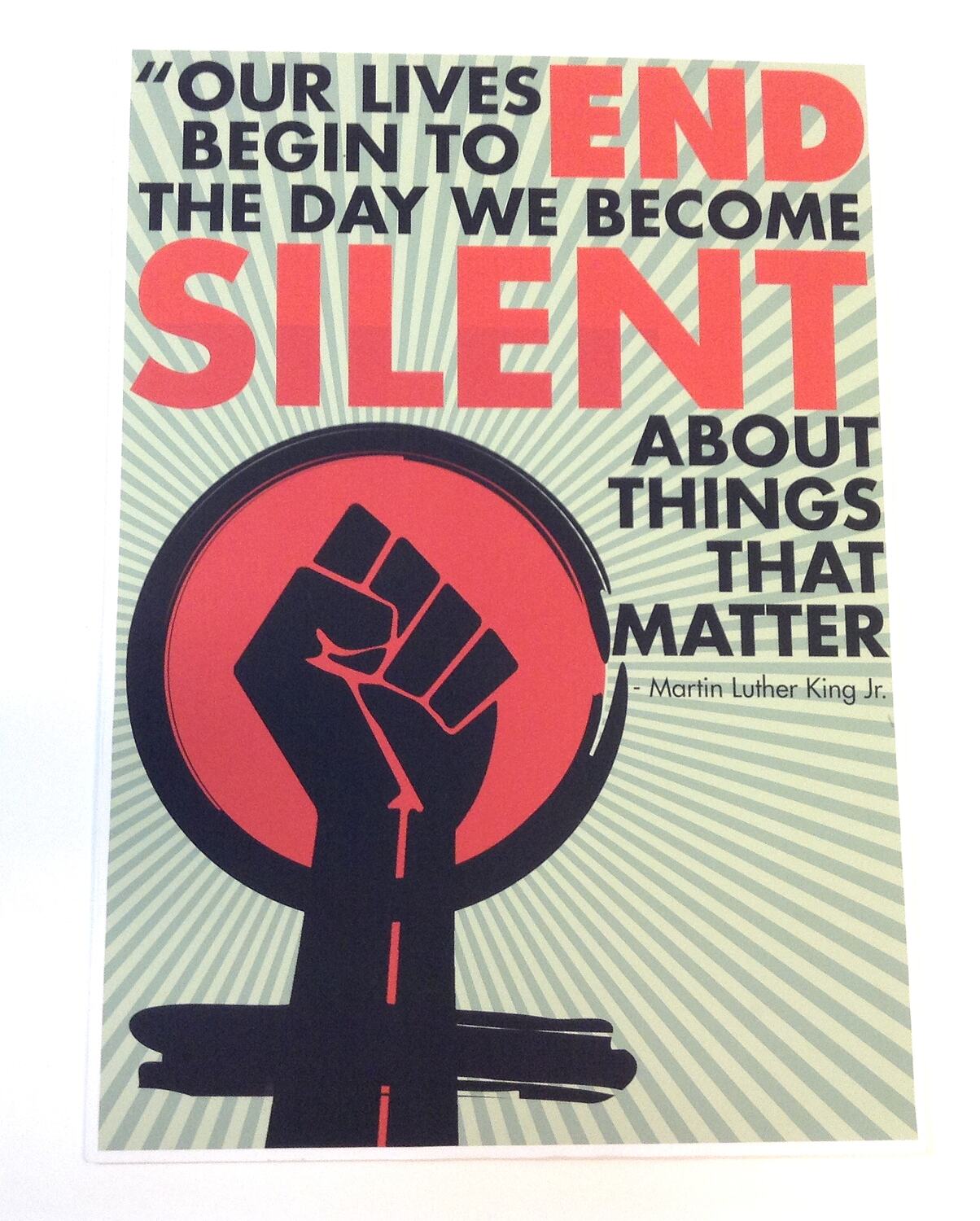 On front: OUR LIVES / BEGIN TO END / THE DAY WE BECOME / SILENT / ABOUT / THINGS / THAT / MATTER / - Martin Luther King Jr.