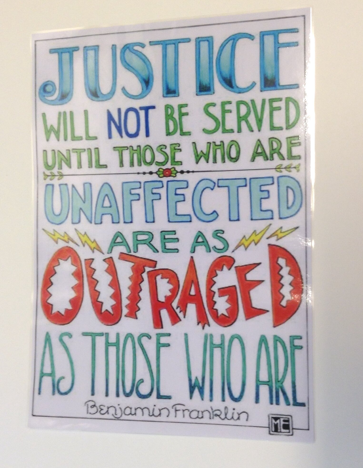 On front: JUSTICE / WILL NOT BE SERVED / UNTIL THOSE WHO ARE / UNTIL THOSE WHO ARE / UNAFFECTED / ARE AS / OUTRAGED / AS THOSE WHO ARE / Benjamin Franklin