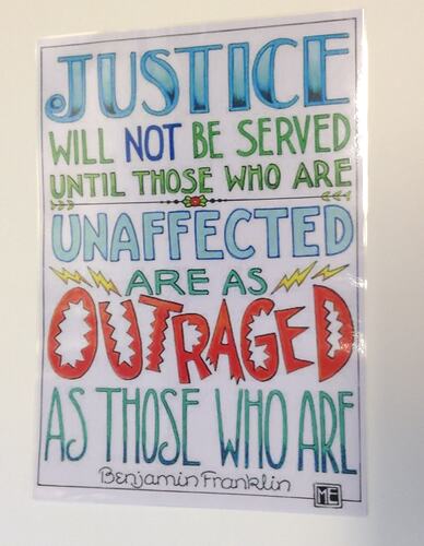 Printed sign with the slogan 'Justice Will Not be Served Until Those Who are Unaffected are as Outraged as Those Who Are - Benjamin Franklin' used at the Women's March on Melbourne. The poster was designed by US based illustrator and artist Mary Engelbreit. On Saturday 21st January 2017 about 6,000 women, men and children marched from the State Library of Victoria to Parliament House as part of the Women's March on Melbourne. It was one of more than 600 coordinated 'Women's March on...' protests that took place across the world on the 21st of January in defence of women's rights and against hatred and bigotry following Trump's inauguration as President of the United States of America. While global in scope and inspired by Donald Trump winning the US Presidency, the marches were nonetheless grassroots in nature with participants marching based on their own interpretation of recent events; some opposed Trump specifically, while others had broader concerns about feminism, women's rights, and the rights of people in the LGBTQ community.