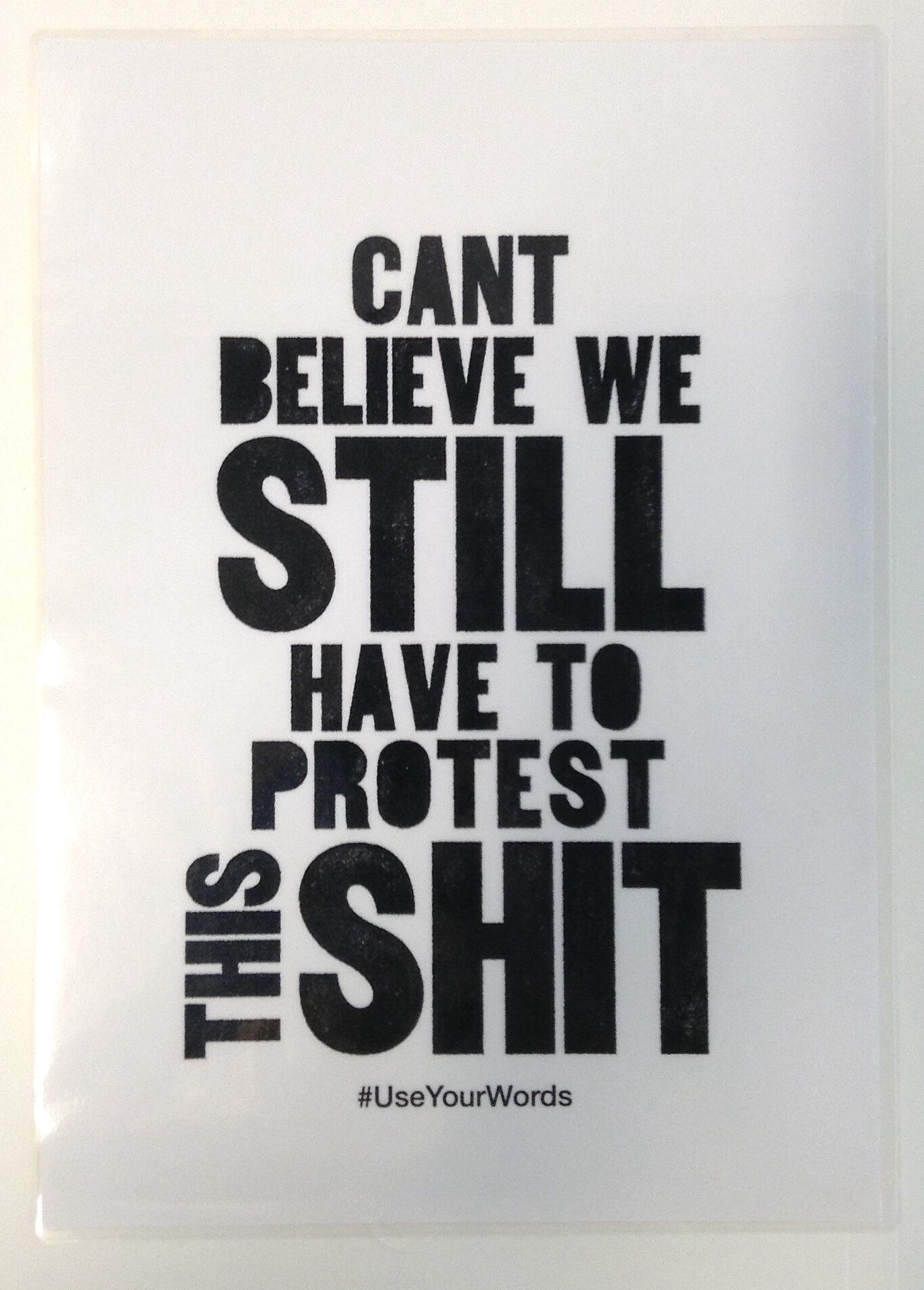On front: CANT / BELIEVE WE / STILL / HAVE TO / PROTEST / THIS / SHIT / #UseYourWords