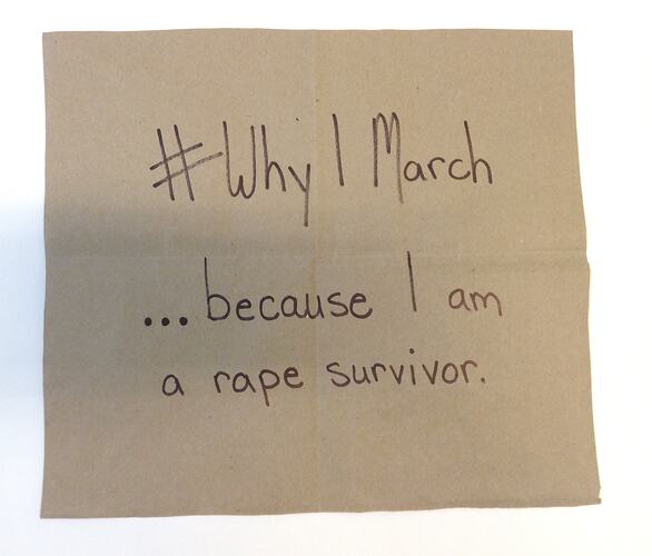 Handmade sign with the slogan '#Why I March.because I am a rape survivor' used at the Women's March on Melbourne. On Saturday 21st January 2017 about 6,000 women, men and children marched from the State Library of Victoria to Parliament House as part of the Women's March on Melbourne. It was one of more than 600 coordinated 'Women's March on...' protests that took place across the world on the 21st of January in defence of women's rights and against hatred and bigotry following Trump's inauguration as President of the United States of America. While global in scope and inspired by Donald Trump winning the US Presidency, the marches were nonetheless grassroots in nature with participants marching based on their own interpretation of recent events; some opposed Trump specifically, while others had broader concerns about feminism, women's rights, and the rights of people in the LGBTQ community.