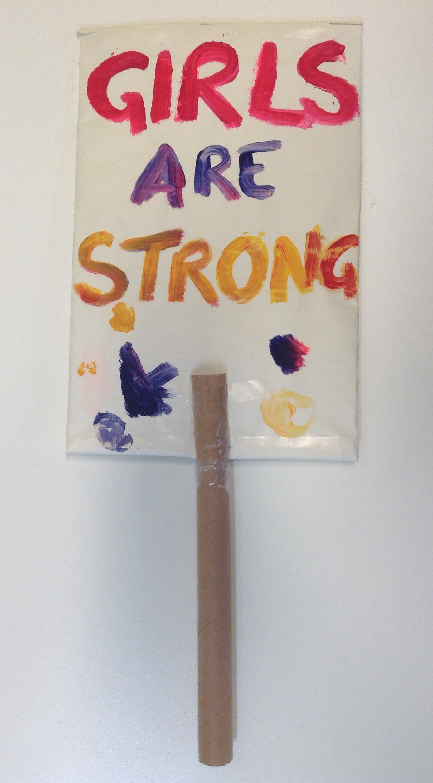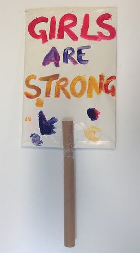 Handmade sign with the slogan 'Girls Are Strong' used at the Women's March on Melbourne. On Saturday 21st January 2017 about 6,000 women, men and children marched from the State Library of Victoria to Parliament House as part of the Women's March on Melbourne. It was one of more than 600 coordinated 'Women's March on...' protests that took place across the world on the 21st of January in defence of women's rights and against hatred and bigotry following Trump's inauguration as President of the United States of America. While global in scope and inspired by Donald Trump winning the US Presidency, the marches were nonetheless grassroots in nature with participants marching based on their own interpretation of recent events; some opposed Trump specifically, while others had broader concerns about feminism, women's rights, and the rights of people in the LGBTQ community.