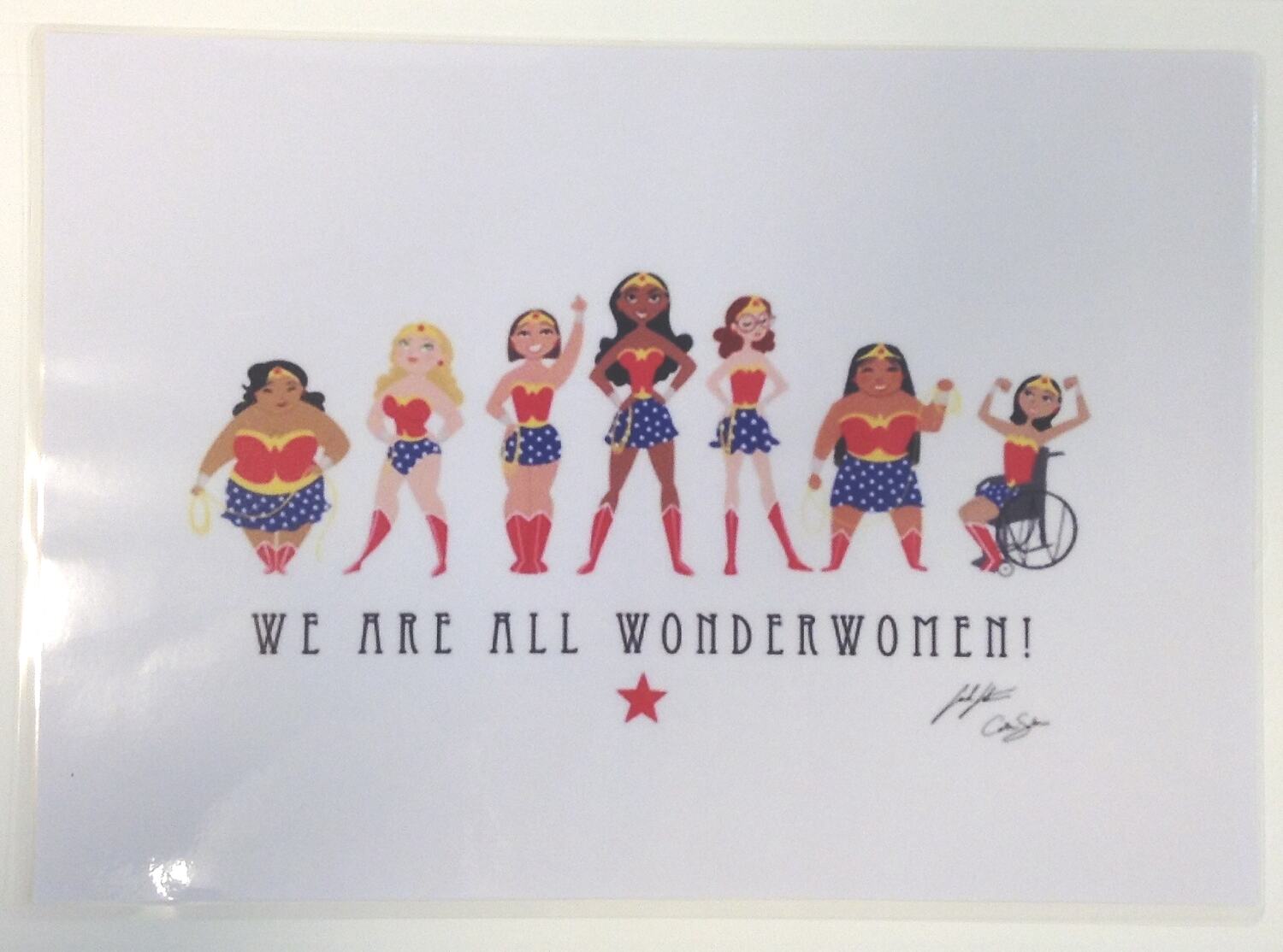Printed and laminated sign. The design features women of different shapes, sizes, ethnicities and one in a wheelchair look fierce and confident all wearing the wonder woman costume. The poster has been signed in the lower left corner.