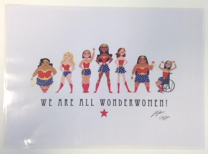 Printed sign with the slogan 'We Are All Wonderwomen!' used at the Women's March on Melbourne. The design was initially created by Chicago-based artists and twin sisters Catherine and Sarah Satrun (also known as the Sketchy Duo) for a comic convention. The twins say the design was heavily inspired by their amazing friends and was a parody/mashup of the Dove ads and Wonder Woman meant to inspire women everywhere. Their goal was to inspire girls and women to become more confident, and to achieve greatness.