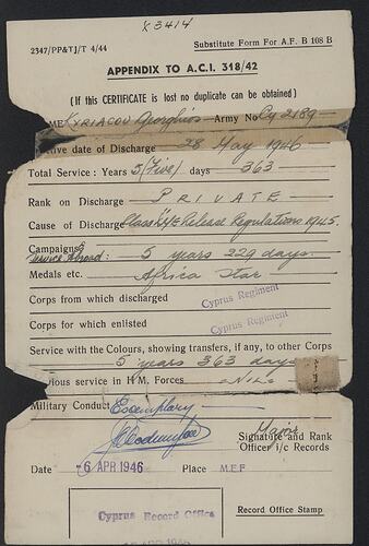 Front inscriptions as follows: X3414\ 2347/PP&TJ/T 4\44 Substitute form for A.F.B 108 B\ APPENDIX TO ACI 318/42\ (If this certificate is lost no duplicate can be obtained)\ NAME: Georghios Kyriakou ARMY NO: CY2189\ [ ]ive date of discharge: 28 May 1946 \ Total Service Years: 5 (five) days: 363\ Rank on Discharge: PRIVATE \ Cause of Discharge: Class XYE Release Regulations 1945 \ Campaigns: Service abroad - 5 years 229 days \ Medals etc: Africa Star \ Corps from which discharged: Cyprus Regiment \ Corps for which enlisted: Cyprus Regiment \ Service with the Colours showing transfers, if any to other Corps: 5 years 363 days\ Precious service in HM Forces: - NIL - \ Military Conduct [illegible signature] [illegible signature] Major: Signature and Rank Officer i/c Records\ Date 6 APR 1946 Place: MEF \ Cyprus Record Office Record Office Stamp. Back inscription as follows: Testimonial in accordance with K RS 1940 para 424 \ A happy cheerful worker, who has given good service. [illegible signature] \