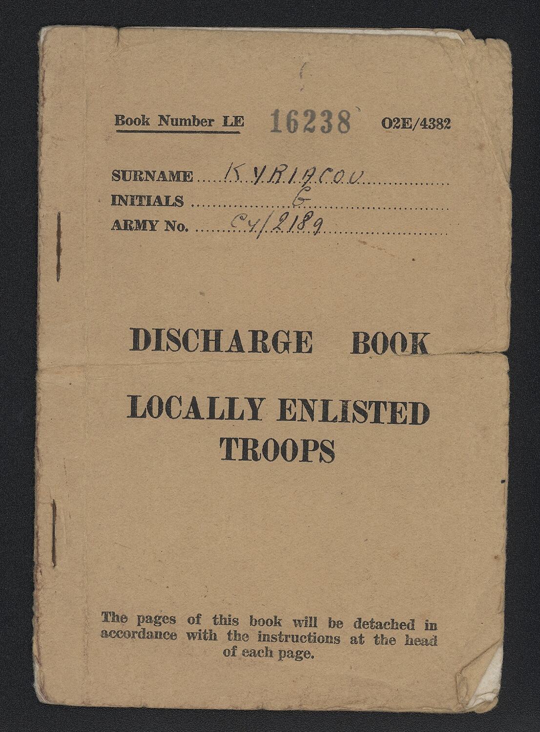 Front Cover: Book Number LE 16238 O2E/4382 \ SURNAME: KYRIACOU \ INITALS: G \ ARMY NO: CY/2189 \ DISCHARGE BOOK \ LOCALLY ENLISTED \ TROOPS \ The pages of this book will be detached in \ accordance with the instructions at the head \ of each page. \ Inside Page: CERTIFICATE \ (Part I and II to be completed by O.C. Unit and Part III \ by O.C. Dispersal Centre. The book to be handed by the \ latter to the individual on discharge) \ Number: CY 2189, Rank: Pte \ Surname: (Block Letters) KYRIAKOU \ Christian Name(s): GEORGIOS \ Regiment or Corps: Cyprus Regt \ Trade Qualifications: NIL \ PART I \ The conduct of the above-named whilst serving with \ the colours has been ( to be compiled by reference \ to K.R paras 425/8 : Exemplary \ Date: 13 /3/46, Signed: [illegible signature] Major \ Commanding 474 Company Cyp. Regt G T \ PART II \ Particulars of Army Educational Attaiment \ The above-named has attended the following courses: \ (i) \ (ii)\ (iii)\ Date 13/3/46 Signed: [illegible signature] Major \ Commanding 474 Company Cyp. Regt G T \ PART III \ This is to certify that the above-named proceeded on \ release leave with effect from : 3/4/46. At the \ termination of this leave he/she will be considered as \ having been discharged from His Majesty's Forces \ Date: 2/4/46, Signature [illegible signature] (O.C Dispersal Centre) Back Cover (in pencil): Iuaupos 2 20 \ oapcos 6ouou 40 90 \ Hc xapuGha 1\ (possible translation: Sardine 2 20\Salmon Fish, 40 90 \With thanks)