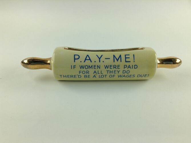 Rolling-pin shaped ash tray with the slogan 'PAY-ME! IF WOMEN WERE PAID FOR ALL THE WORK THEY DO, THERE'D BE ALOT OF WAGES DUE' likely produced in Japan, circa 1950s. The slogan on the ashtray speaks to a number of issues relating to women's employment during the 1950s. While more women were entering paid work during the 1950s, they were not paid the same rates as men for the same work; there were also a number of women that found themselves pushed out of jobs when men returned to their former employment following World War II. As illustrated by the rolling pin shape of the ash tray there was also the ongoing issue of the division of household labour and child rearing and the hidden value of this work to the economy.