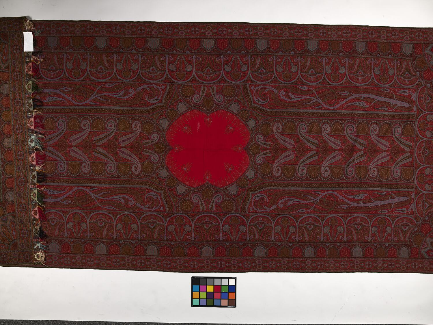 Paisley shawl made circa 1850s, owned by Charlotte (Lizzie) Twycross. It may have been used by her when visiting the Melbourne International Exhibition at the (Royal) Exhibition Building, 1880-81.