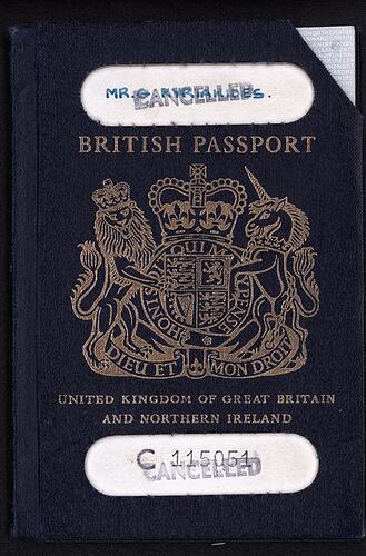 Passport contains 32 interior pages, and is bound by a front and back cover with blue vinyl-like cardboard. It has been stamped as cancelled, and the top and bottom right corners have been cut off.