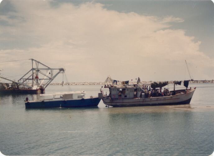 Photograph of a wooden refugee boat anchored in the harbour at Kuantan, East Malaysia in December, 1978. A smaller vessel has pulled alongside, possibly to assist with evacuation/disembarkation. The photograph is one of a series taken by PT Penkonindo employee Tim Baker. Another boat, PK 1867, arrived with refugees from Vietnam around the time this photograph was taken. They are believed to be the first refugees to arrive there from Vietnam.