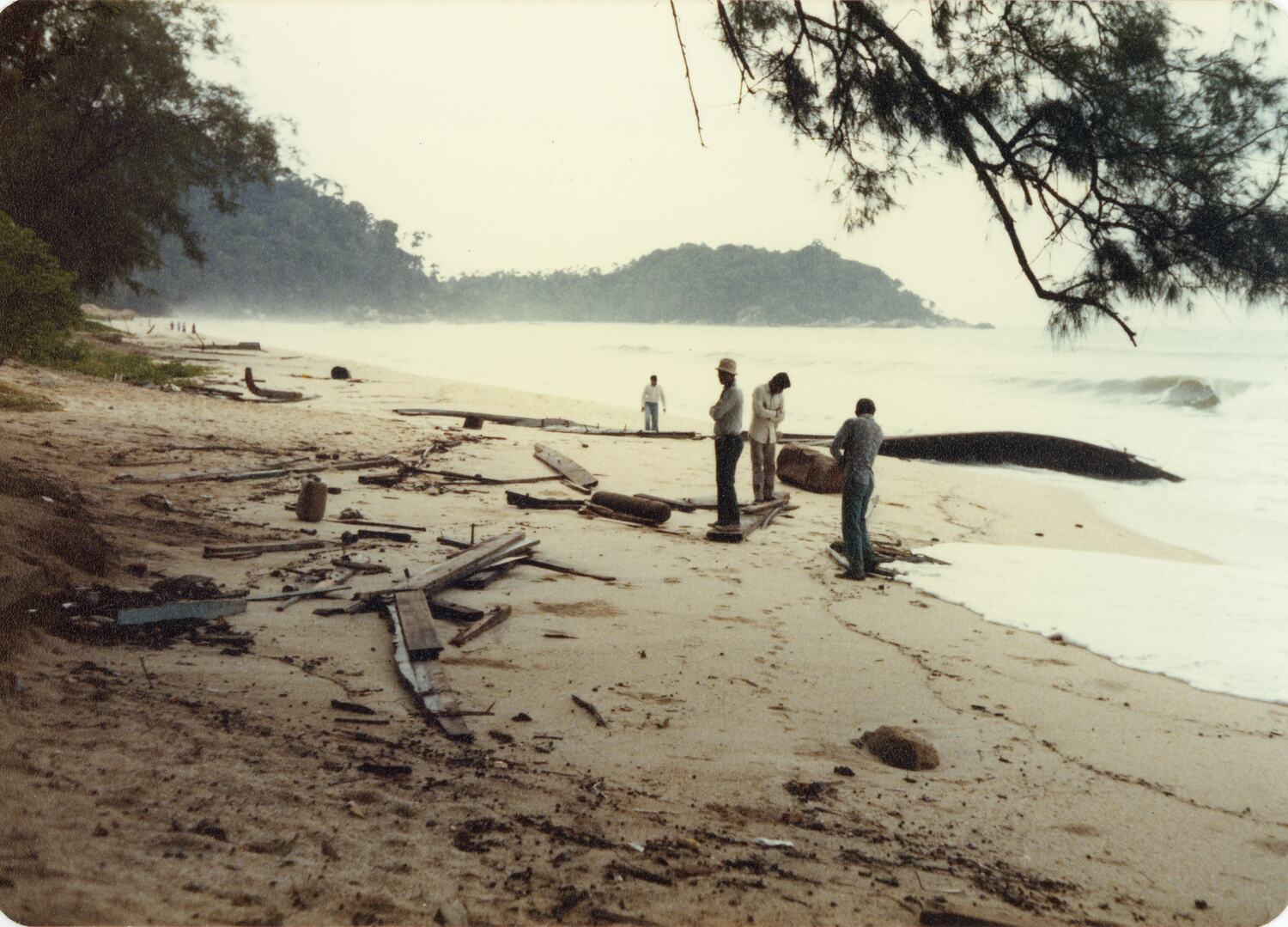 Photograph of a four men inspecting some washed-up timber wreckage at the water's edge at Kuantan, East Malaysia in December, 1978. The timber may be from a recently-arrived refugee boat and the men may be locals or some of the refugees. The photograph is one of a series taken by PT Penkonindo employee Tim Baker. Another boat, PK 1867, arrived with refugees from Vietnam around the time this photograph was taken. They are believed to be the first refugees to arrive there from Vietnam.