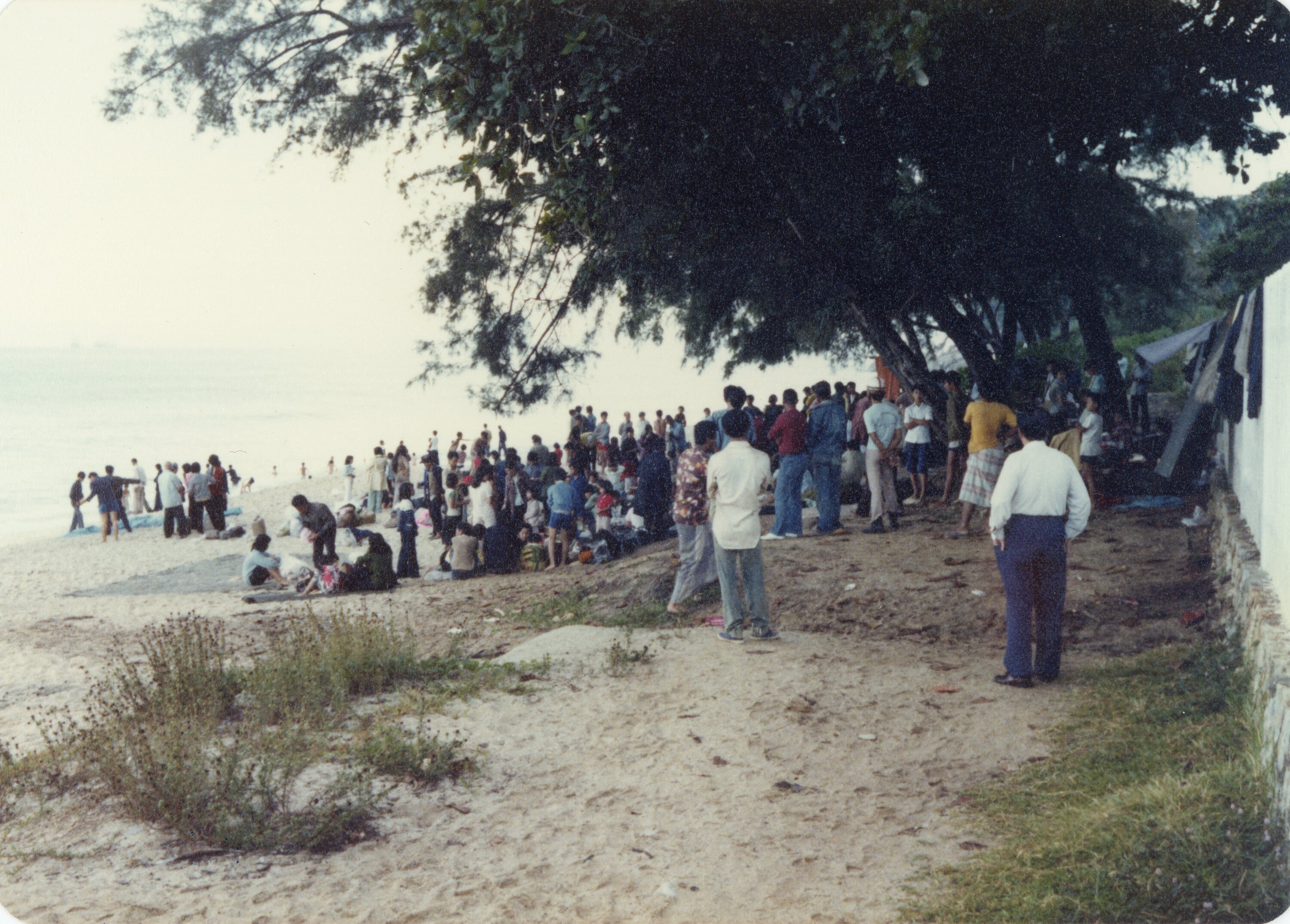 Photograph of about 110 men, women and children standing or sitting on the beach under trees at Kuantan, East Malaysia after the first refugees arrived there from Vietnam in December, 1978. The photograph is one of a series taken by PT Penkonindo employee Tim Baker. Another boat, PK 1867, arrived with refugees from Vietnam around the time this photograph was taken. They are believed to be the first refugees to arrive there from Vietnam.