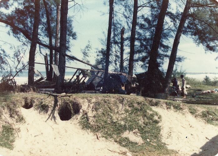 Photograph of a few people at a makeshift shelter erected under the trees off the beach at Kuantan, East Malaysia after the first refugees arrived there from Vietnam in December, 1978. The photograph is one of a series taken by PT Penkonindo employee Tim Baker. Another boat, PK 1867, arrived with refugees from Vietnam around the time this photograph was taken. They are believed to be the first refugees to arrive there from Vietnam.