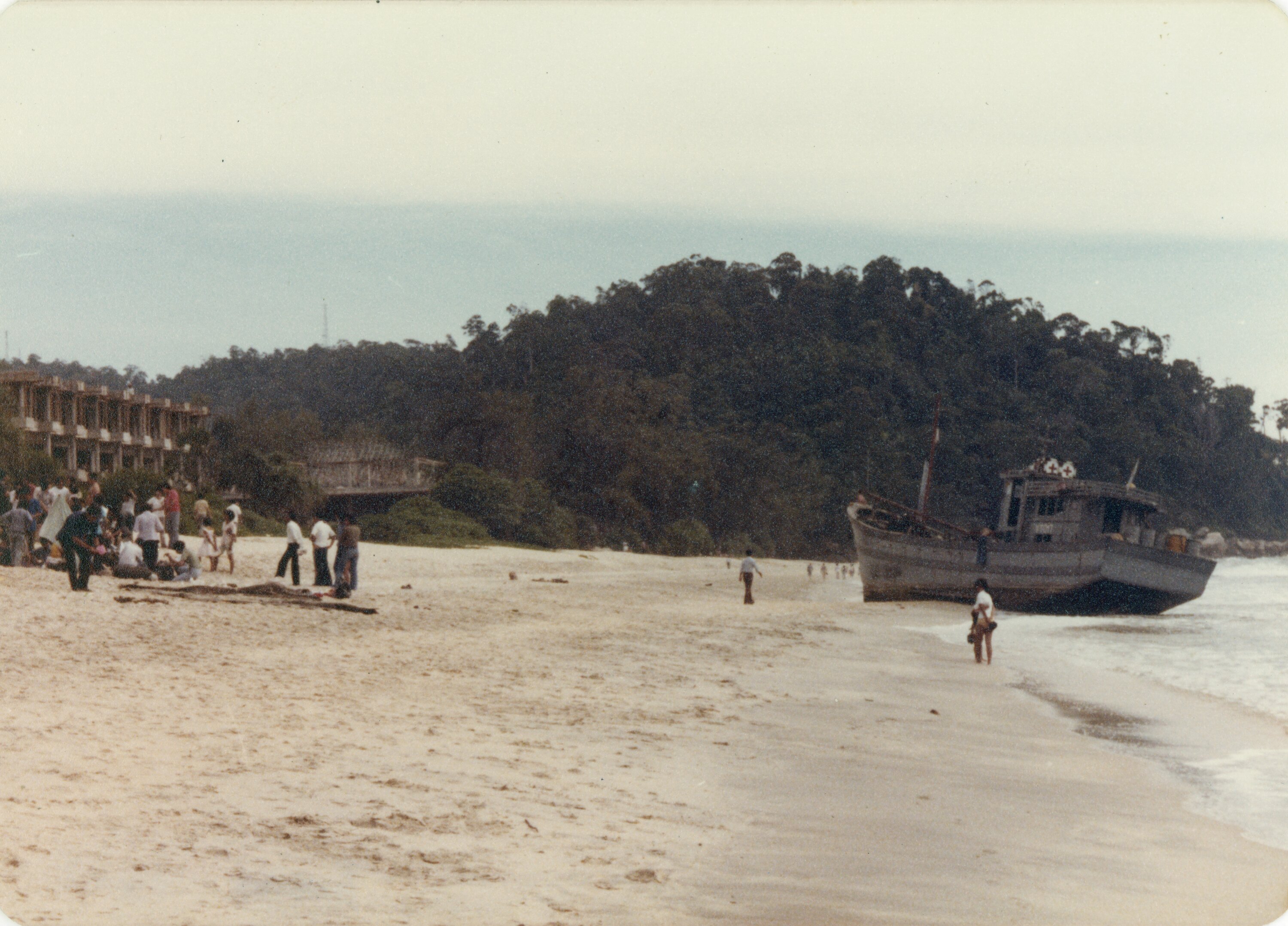 Photograph of a wooden refugee boat VT017 lying aground at the water's edge at Kuantan, East Malaysia in December, 1978. The photograph is one of a series taken by PT Penkonindo employee Tim Baker. Another boat, PK 1867, arrived with refugees from Vietnam around the time this photograph was taken. They are believed to be the first refugees to arrive there from Vietnam.