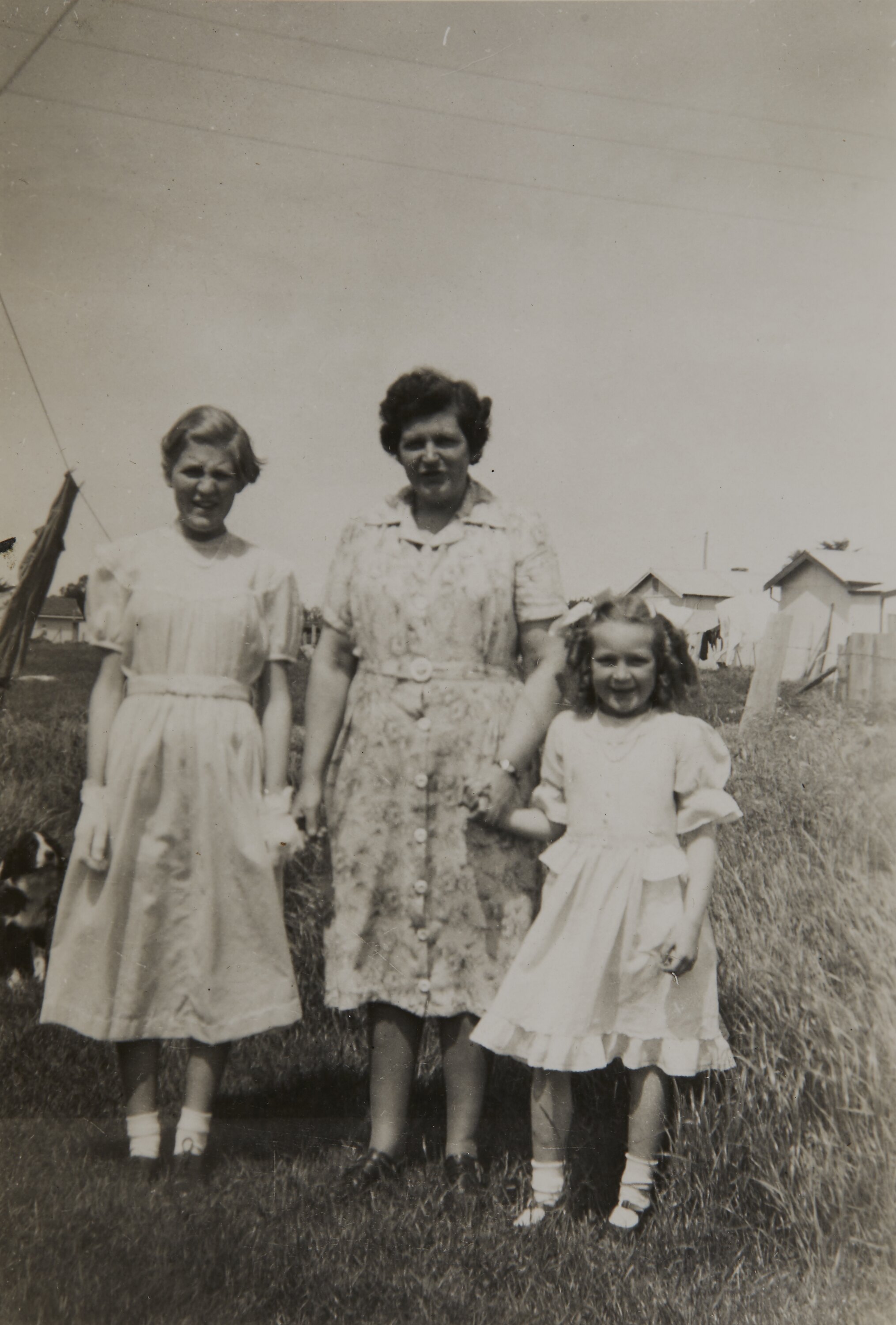Photograph of Hazel, Lucy and Merle Hathaway in the garden of their house at 29 Grammar St, Wendouree, Victoria.