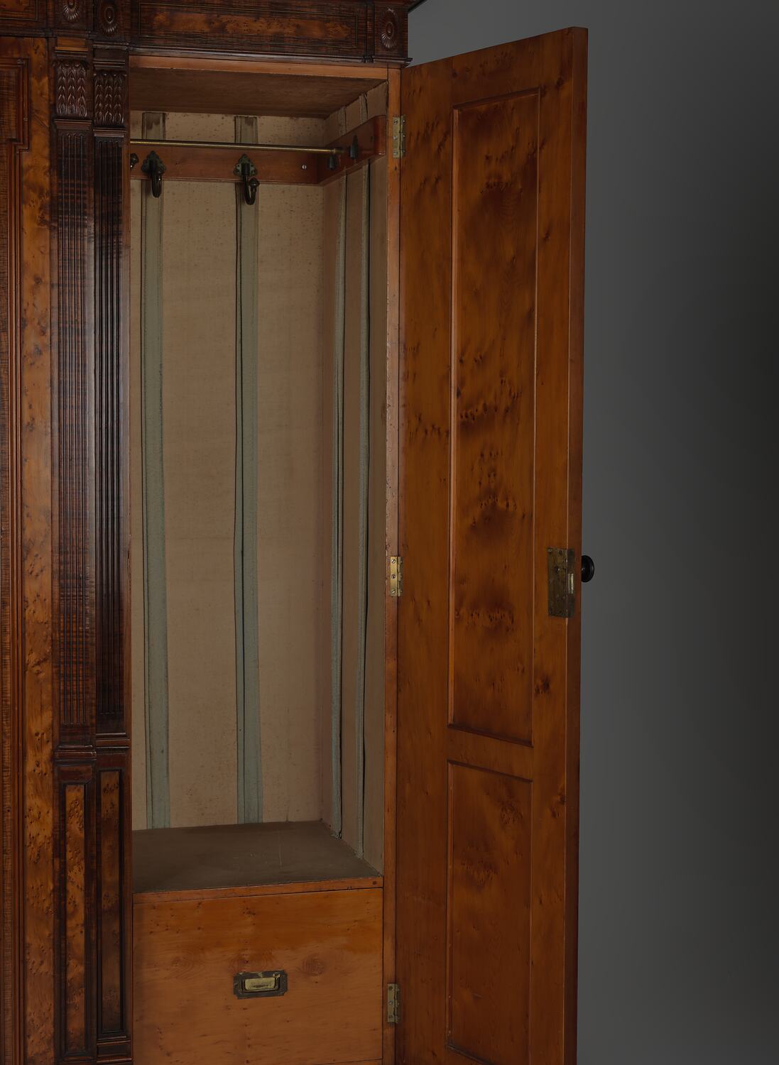 Three door wardrobe made of blackwood and Huon pine, inlaid with ebony and holly and with carved blackwood and Huon pine decoration. The central door has a mirror and the two side doors are decorated with elaborate inlay work. The two side cupboards are lined in white and blue fabric and have a brass railing and hooks. The central cupboard has three full drawers (which are graduated in size), an open shelf, two drawers and an open shelf.