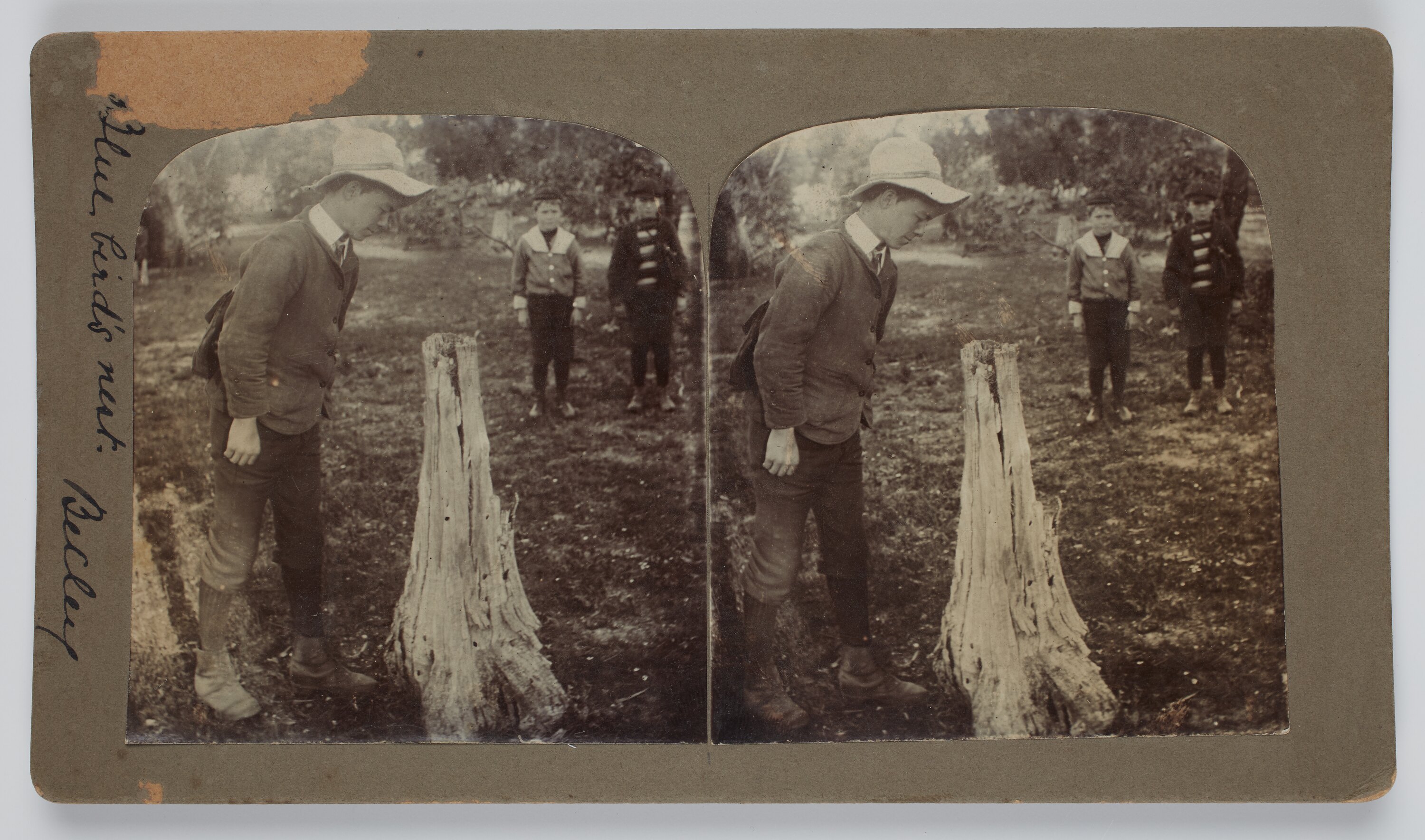 Black and white stereograph of three boys looking at a bluebird's nest in the hollow of a tree stump.