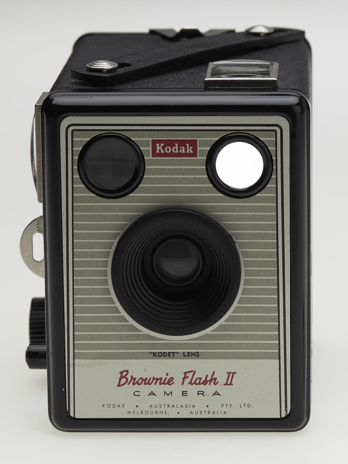 The Brownie Flash II camera model was originally designed and built by Kodak Limited, England and was imported to the Australasia region. However, in 1957 Kodak Australasia began to assemble this camera at its Abbotsford factory from parts imported from England, making the Brownie Flash II the first Kodak camera model to be assembled in Australia.