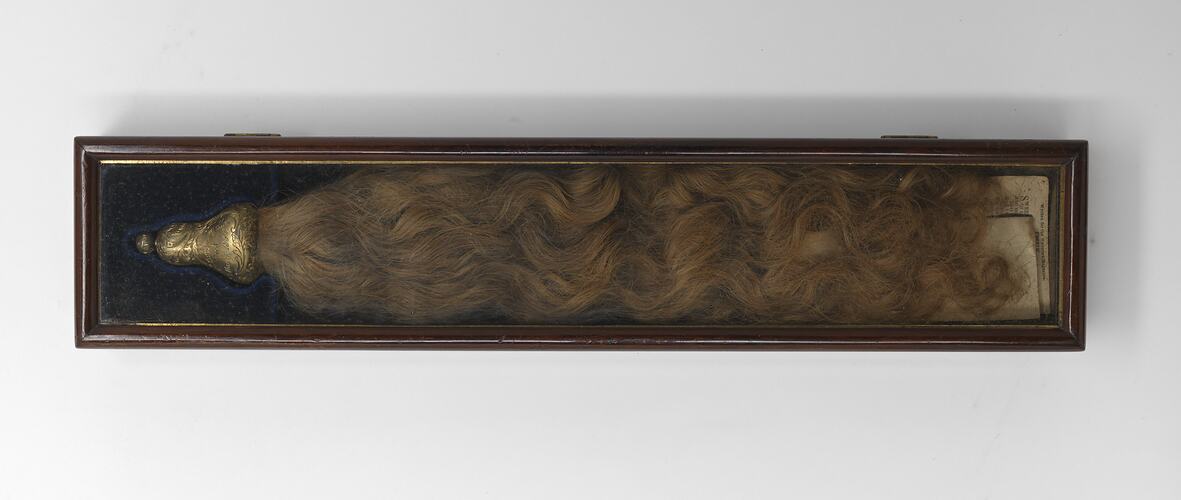 Lock (ringlet) of hair held with an engraved gold bell shaped clasp. Housed in a velvet lined wooden box with a glass front, under the ringlet some paper documents are visible.