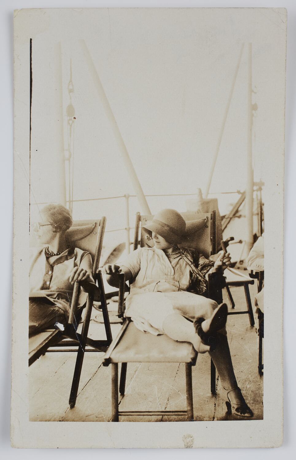 Black and white photograph of the Duchess of York and Lady Davidson sitting on deck chairs on board a ship.