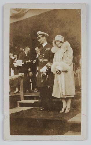Man and woman standing on the steps of a platform. The woman is dressed in a white fur coat and hat, the man is dressed in a naval uniform. Two other men can be seen in the background.