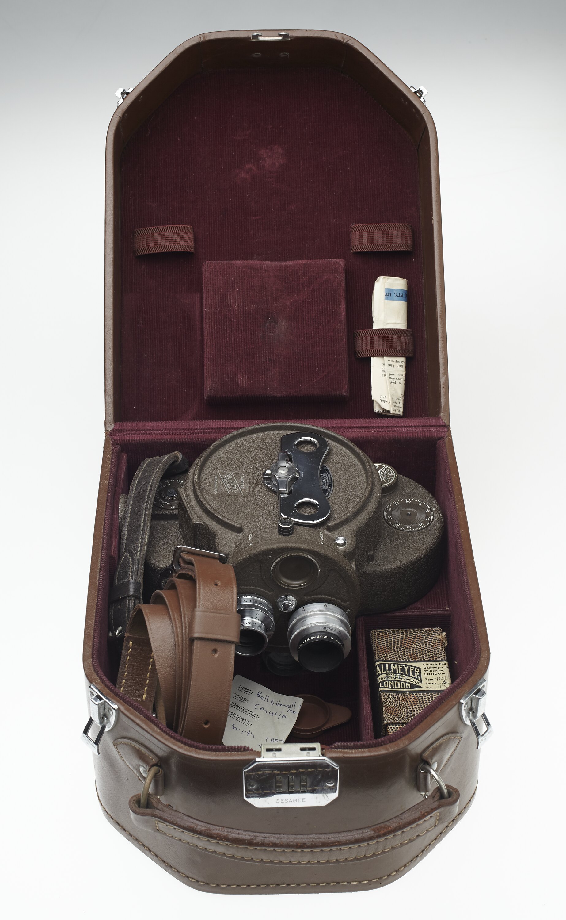 Die-cast metal 16mm movie camera with leather case, instructions and attachments. Stickers for Kodak on the outside of the case. Case has two latches and a combination lock.