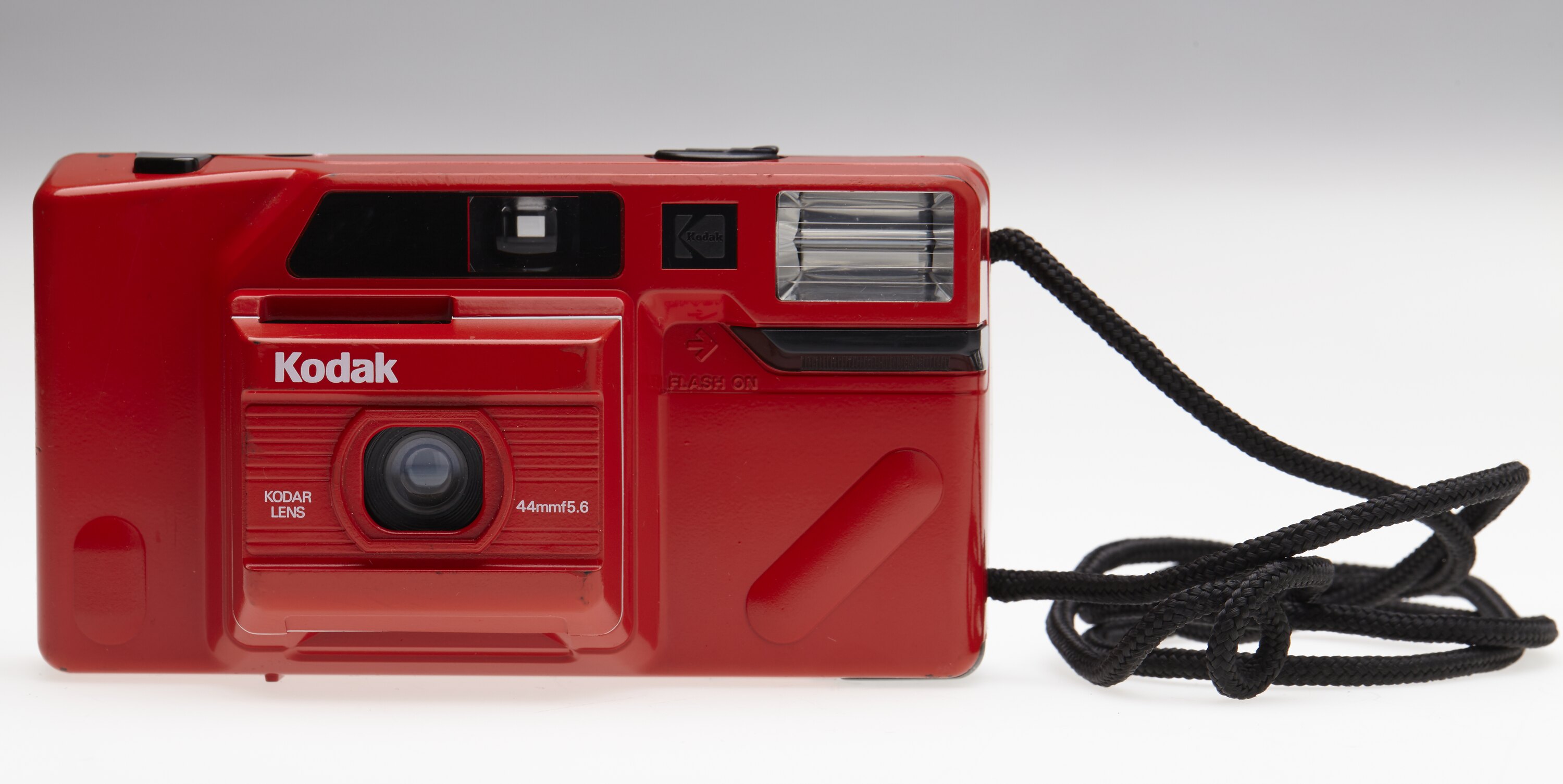 Red plastic camera with built in flash. Long black cord neck strap.