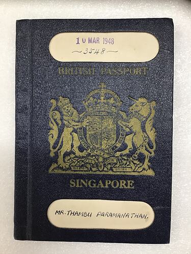British passport (Singapore) brought to Australia by Nathan Paramanathan when he migrated in 1949.