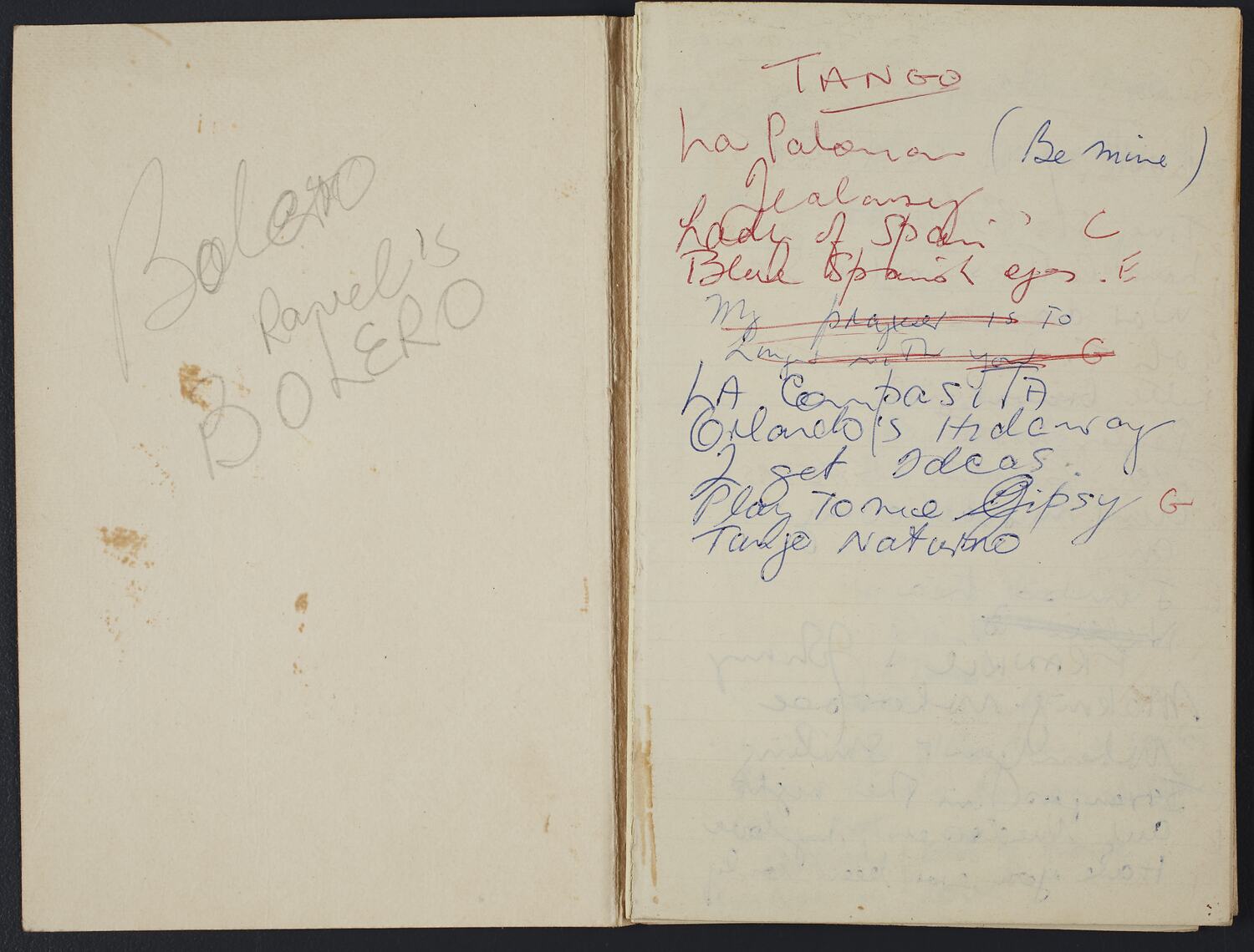 Notebook containing handwritten lists of songs collected by Bernice Kopple who had migrated from Scotland to Australia, in December 1950 onboard the ship New Australia. Bernice probably kept this list to inform her selection of music for her various cabaret performances.
