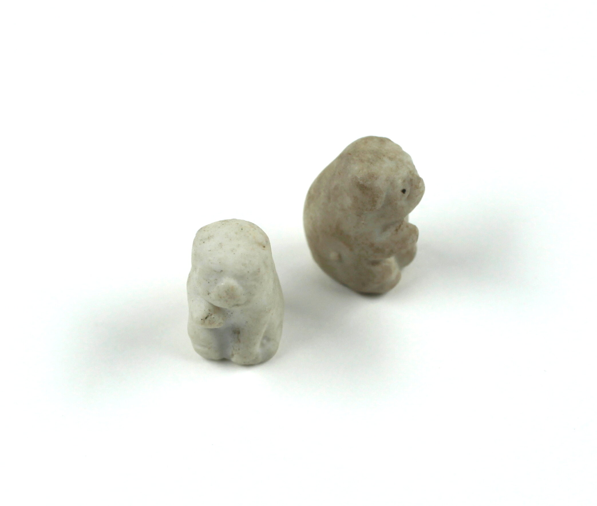 Two animal toy animal figurines. White coloured ceramic, slightly discoloured. Sitting down with left paw raised. Have dog like features, with floppy ears and a snout.