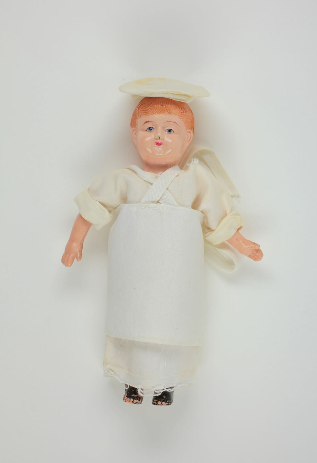 Toy male chef. He's wearing a white apron and hat. The doll represents Neil McArthur, maker of the doll's house. He later became a chef at Holcomb House (later named Tasma Court). The doll with the chef's clothes represents him.