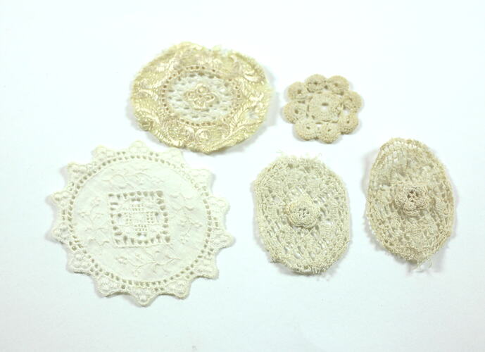 Five toy doilies, of varying shapes and sizes. Two crocheted oval ones appear to match, with similar lacework patterning and a lace flower in the centre of each. Cream coloured. One large oval embroidered doily, with a diamond shape cutwork decoration in the centre and decorative edge. Off-white coloured. One small round crocheted doily, in a circular pattern and cream coloured. One medium size embroidered doily with a silken finish. Cutwork oval in centre with floral motif.