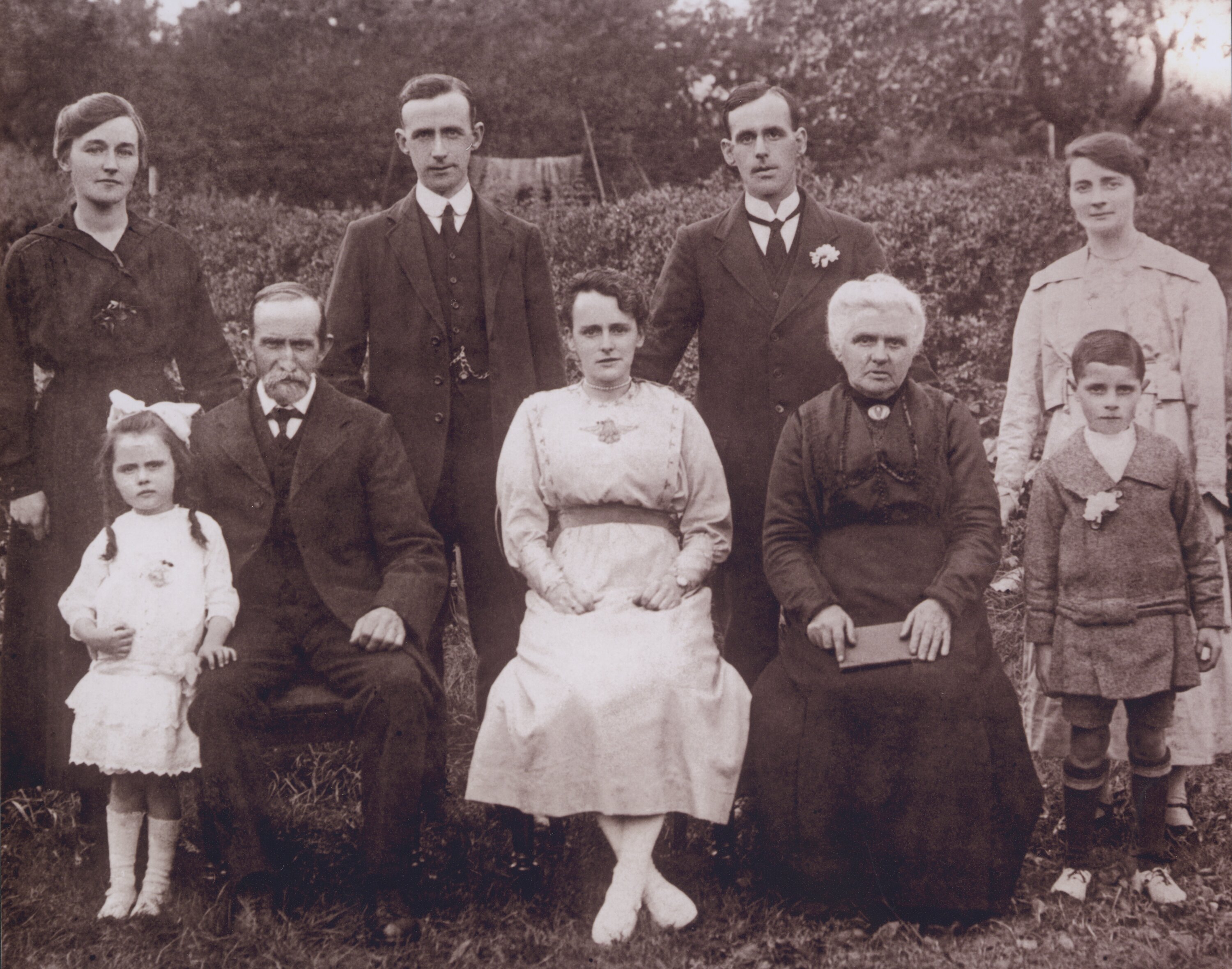 Family group of nine people, men, women and children, three seated, in outdoor setting.