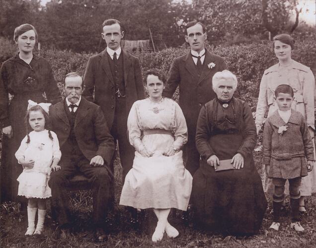 Photograph of the Murchie family taken in Scotland around the time Isabella Murchie migrated with her family to Australia in 1919. Isabella was born in Scotland on 24 November 1890. The photograph features, front row (left to right): Isabella Reilly Murchie, Gavin Lanson Murchie Snr, Isabella McGregor Murchie, Isabella McGregor Reilly, Gavin Lawson Murchie: back row (left to right): Marion Forrest Richie, John Valdemar Murchie, Thomas William Murchie and Jane Stewart Ireland.