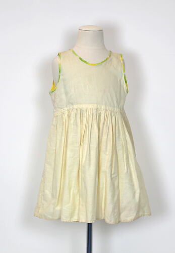 Cotton petticoat with decorative trim around neck and armholes. Centre back opening. Small pleats at waist.