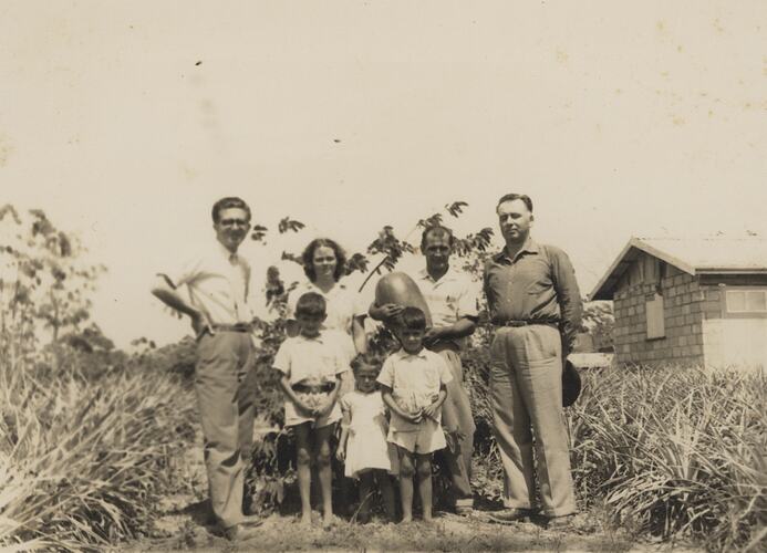 Black and white digital photograph of Ishak Imamovic (far right) with his family and a friend Imam Ahmed Skaka (far left) in Brisbane, 1950s.