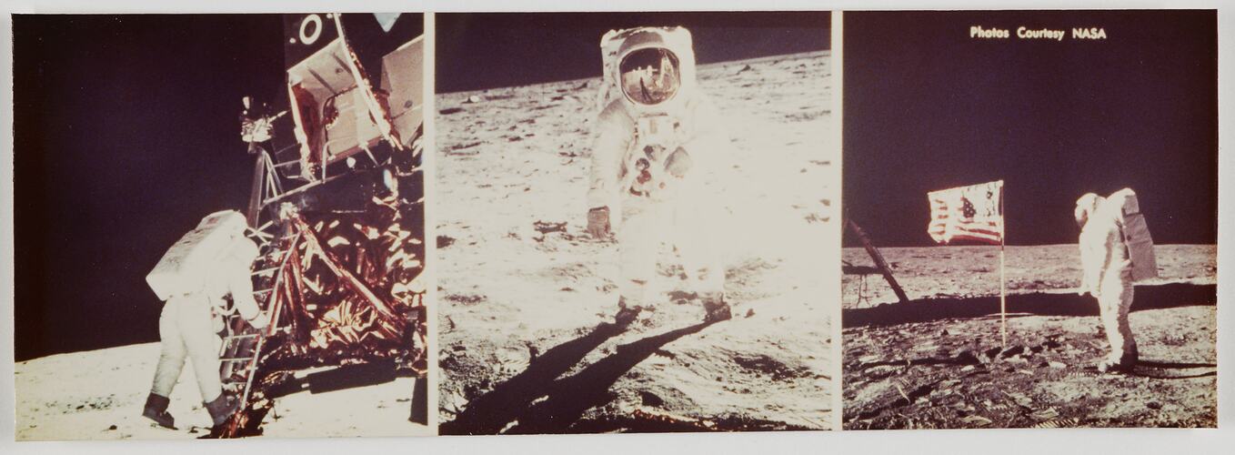 Printed, verso: 'Oct. 80', 'PRINT / MADE / By / KODAK / M', and 'ELITE 35 PRINTS' Caption in folder: '023 APOLLO 11 TRIPTYCH' Printed, on far right image: 'Photos Courtesy NASA'