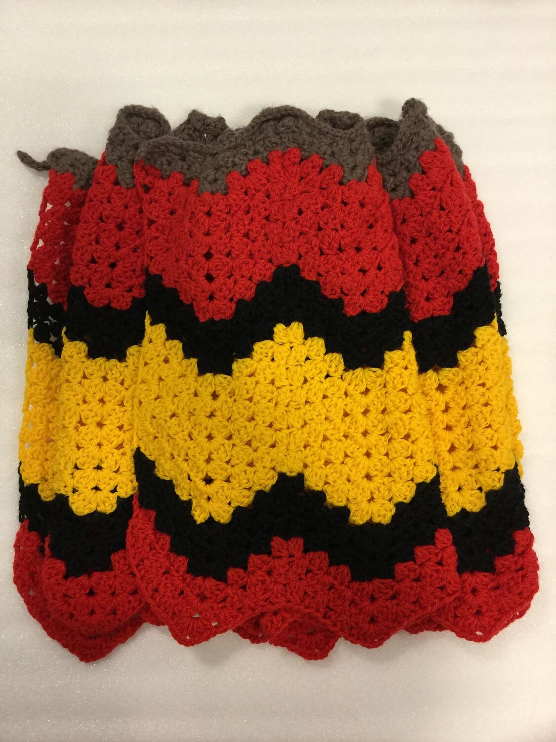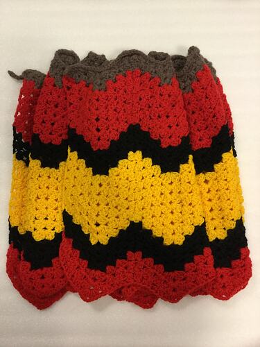 Red, black, yellow and brown wollen crochet table runner with a wavy/zig zag pattern and edges.