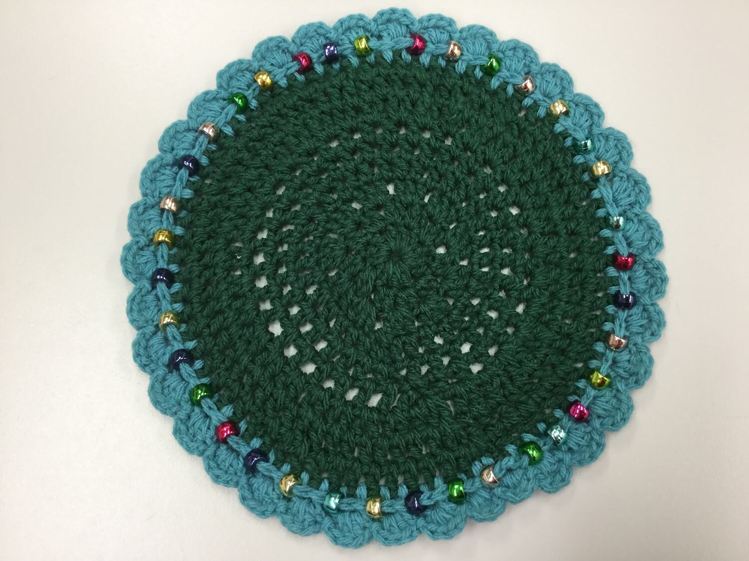 Woollen crocheted green and teal circular table centre piece with an upbraided ring of multicolour plastic beads along a teal scalloped border.