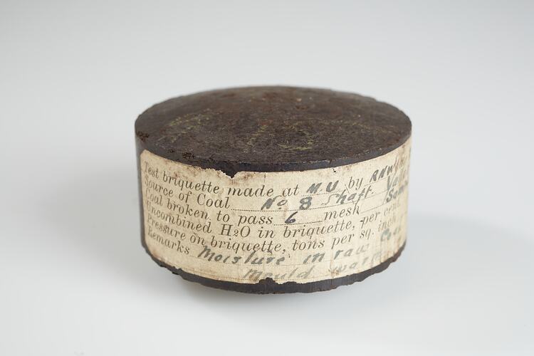 Paper label wrapped around circumference reads: 'Test briquette made at ... M.U. .. by ... RNW .. date ... 25.5.22 / Source of coal ... No.8 Shaft .. Yallourn ... ......... / Coal broken to pass ... 6 ... mesh ... Sample ... No.25 / Uncombined H2O in briquette, per cent .......... 15 / Pressure on briquette, tons per sq. inch ............ 9 / Remarks ... Moisture in raw Coal ................... 74.4 / .................... Mould warm ....................'