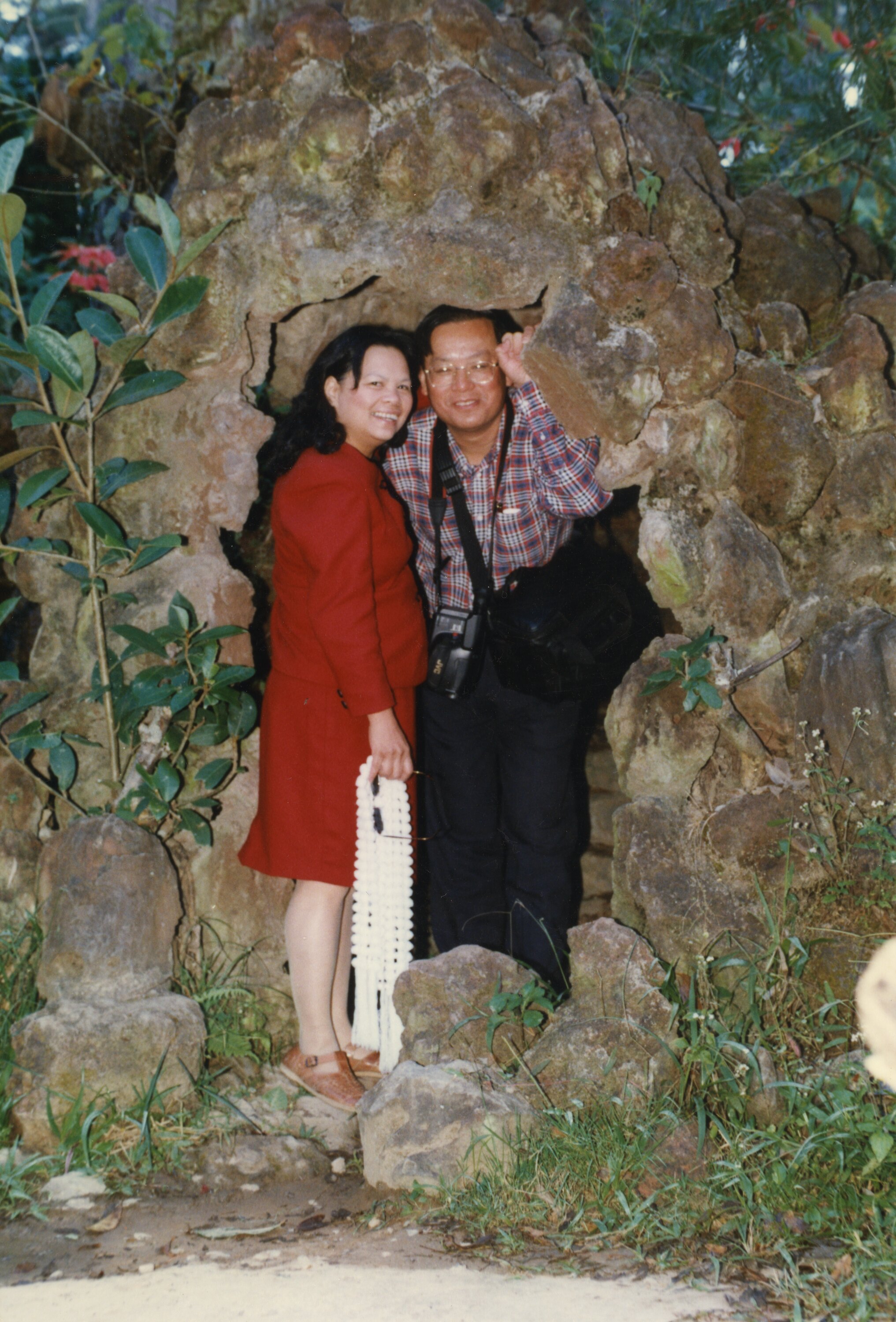Digital photograph of Cuc and Minh Lam standing in a cave entrance on a tour in Dalat, Vietnam during a holiday to visit family in 1996. Cuc and Minh fled Vietnam in 1978 as part of a massive emigration after the end of the Vietnam War and migrated to Melbourne.
