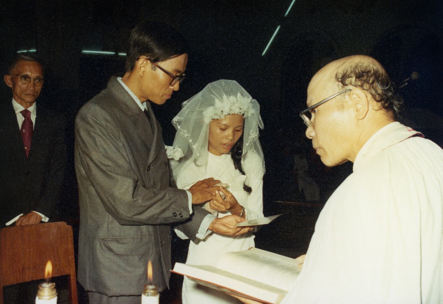 Digital photograph of Cuc and Minh Lam at their wedding ceremony, Our Lady Church, Saigon, 30 May 1975. This image was taken during the exchange of wedding rings when Cuc placed the ring on Minh's finger.This photograph was taken three years before Cuc and Minh fled Vietnam in 1978 as part of a massive emigration after the end of the Vietnam War.