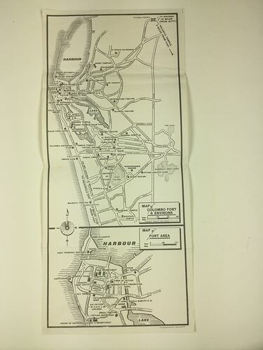Tourist map used by Beryl Adams while on shore leave in Colombo, Sri Lanka. It includes a map of the Fort area and general surrounds. Beryl Adams came to Australia as an assisted migrant from England on the Orient Line SS Oronsay in 1959. She then travelled back to England to visit family in 1967 on the SS Arcadia, and returned to Australia in 1968 on the SS Oriana.