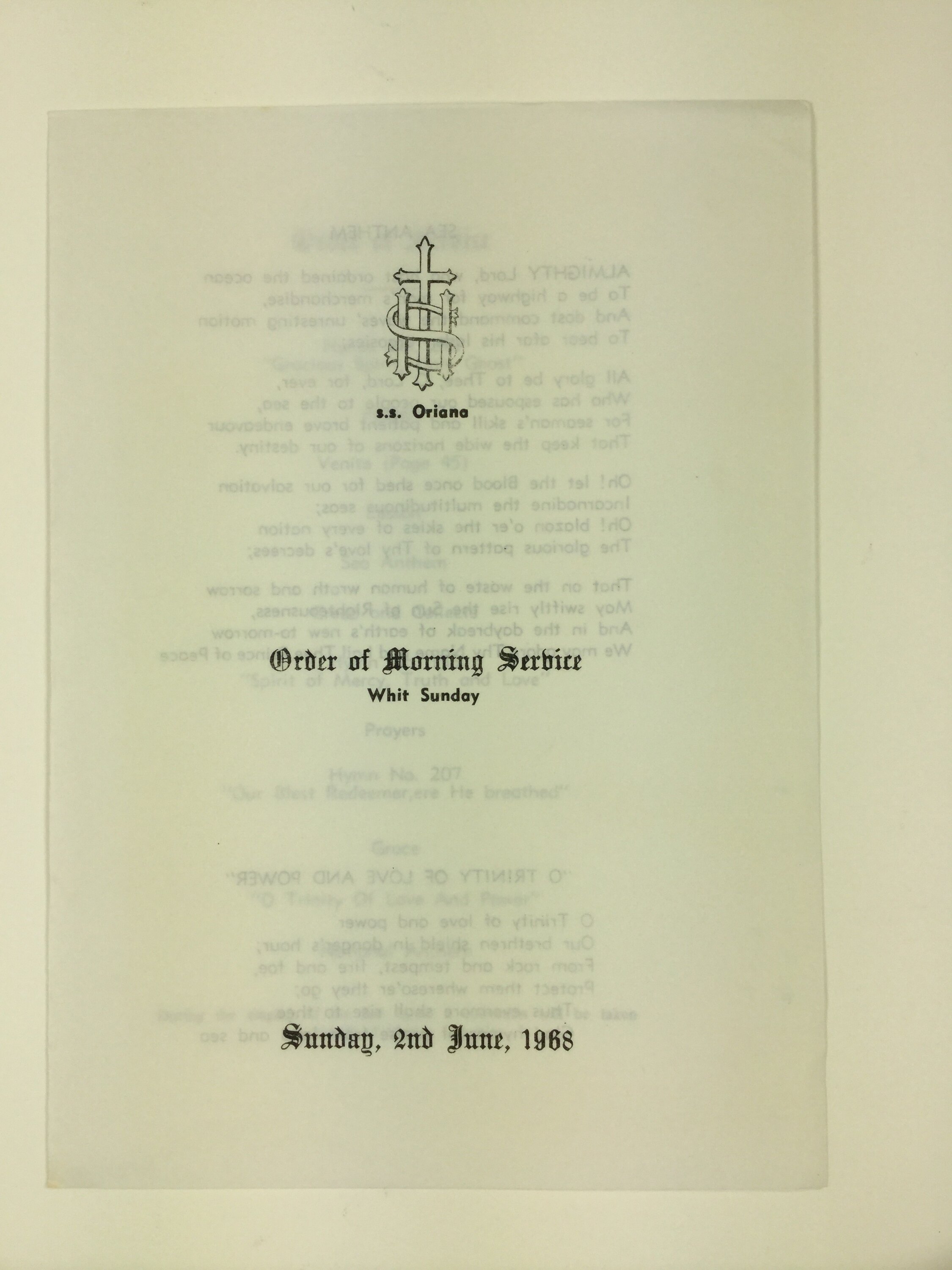 Pamphlet detailing the order of service for Whit Sunday religious service. The pamphlet was given to Beryl Adams while on-board the SS Oriana in 1968. Beryl Adams came to Australia as an assisted migrant from England on the Orient Line SS Oronsay in 1959. She then travelled back to England to visit family in 1967 on the SS Arcadia, and returned to Australia in 1968 on the SS Oriana.